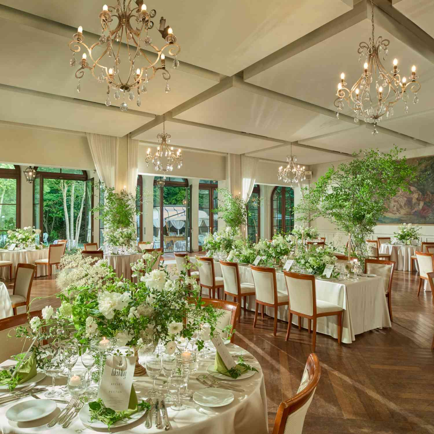 全天候型のセレモニーホールとガーデンで挙式が可能。昼は小鳥のさえずりと陽光がふたりを祝福し、夜は森のライトアップとキャンドルが幻想的な雰囲気を演出。四季の自然美が永遠を誓う花嫁の姿をより美しく見せる。