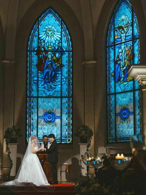 イタリアの工房で制作された高さ6mのステンドグラスが、誓いの瞬間のふたりを美しく照らします。400年の歴史を刻むパイプオルガンの調べが響き渡る空間はまさに圧巻。