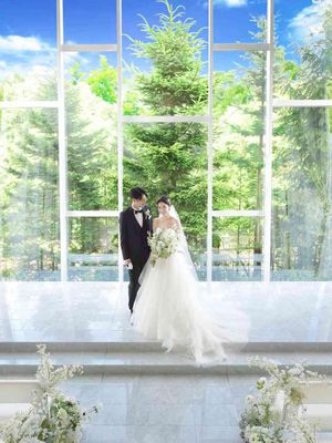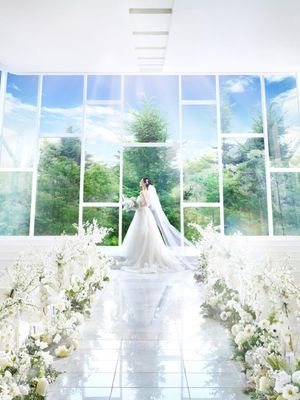 豊かな緑と広がる空はおふたりの結婚式の日にしか見られない特別な景色。大理石の10mのバージンロードにふたりの姿が映るのも人気のチャペルポイント