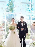 祭壇の向こうが一面ガラス張りのチャペル。入口から一歩ずつ進むごとに天井が高くなるから、開放感に満ち溢れている。ゲストに見守られながら祭壇で待つ新郎の元へ、バージンロードをゆっくりと歩んで。自然を望み、ふたりもゲストもリラックスした状態で挙式に臨めると好評。アットホームな雰囲気の中誓いを。