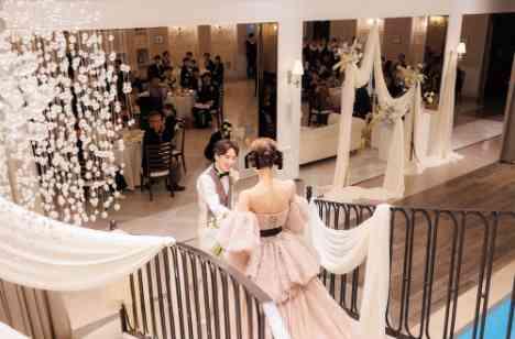 お二人のお色直し入場は、まずはご新郎様お一人でのご入場。ご友人様やご家族様のテーブルをまわりながら階段へと向かいます。そして、ご新婦様は階段上からのご入場。階段上だからこそ、ドレスをしっかりお披露目できる特別な瞬間です。ご新郎様がご新婦様をお迎えに行き、階段をエスコートで一緒に降りられる姿や、ご新婦様のドレス姿はとても印象的な入場シーンとなりました。