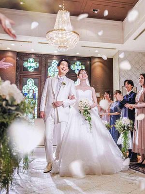 挙式を終えたふたりを大階段でゲストのフラワーシャワーと笑顔が包む。 光と歓声に彩られたこの瞬間は、挙式の余韻をさらに華やかにし、家族や友人に見守られながら歩む一歩一歩が、一生の宝物となる特別なひとときとして刻まれる・・・・