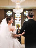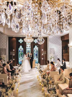 天井に浮かぶ宝石のようなスワロフスキー製シャンデリア。透明に散りばめられた光の中、ふたりは長いバージンロードを歩き、特別な時間を刻む。