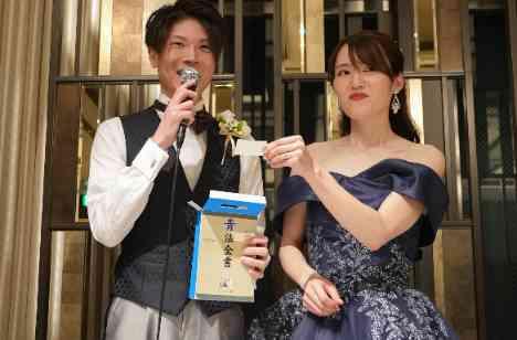 披露宴ではドレス色あてクイズを行い、会場全体で盛り上がる時間を用意しました。正解された方だけでなく、外れてしまった方にも楽しんでいただけるよう、私たち二人にちなんだ賞や、共通の思い出でもあるサッカーチーム「コンサドーレ」に関連した景品をご用意しています。結果に関わらず笑顔になれる演出を通して、ゲストの皆さまと一体感のある楽しいひとときを過ごしたいという想いを込めました。