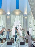 当式場は+の演出としてフェザーシャワーも行うことができます♪ ふわふわとした白い羽が天井からゆっくり落ちてくる様子はまるで天使のよう。お写真に残した時も素敵ですし、おふたりの挙式がよりロマンチックに仕上がります! 青い大聖堂と白い羽の相性も抜群☆