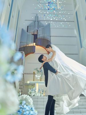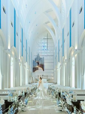 当式場は+の演出としてフェザーシャワーも行うことができます♪ ふわふわとした白い羽が天井からゆっくり落ちてくる様子はまるで天使のよう。お写真に残した時も素敵ですし、おふたりの挙式がよりロマンチックに仕上がります! 青い大聖堂と白い羽の相性も抜群☆