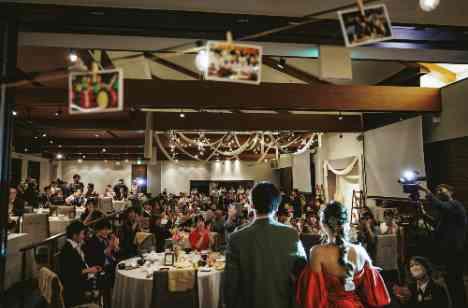 新郎新婦からゲスト、ゲストからお2人が見える位置関係でパーティ会場を創設している為、互いの笑顔がすぐに見えてくれる♪ゲスト全員参加型のイベントはもちろん、ガーデンには焼きマシュマロが食べれるミニコーナーも設営し、大人も子供も大満足♪ご両家のご実家で創っている果物や地元の食材なども景品やプレゼントとしてご準備し、ゲストの方々も懐かしみながら最後まで笑顔が絶えない空間でした!