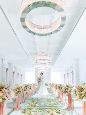 窓から注ぐ自然光でキラキラと輝く天井のクリスタルと、可愛いピンクのグラデーションのお花のバージンロードはお二人の姿がまるで絵画のように際立ちます