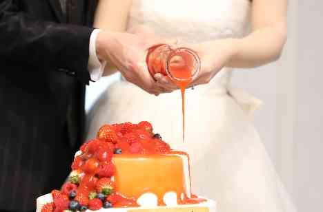 お打合せ当初から『やりたいです!』をご希望をいただき実現されたカラードリップケーキセレモニー!ナイフで入刀するのではなく、ソースをかけてオシャレにケーキを完成させるのがとってもかわいらしい共同作業の演出♪ ソースをかける前と後では雰囲気の異なるケーキに会場は盛り上がりを見せ、ゲストの皆様も沢山お写真撮影されておりました!