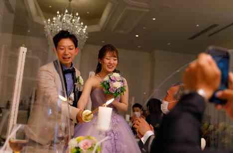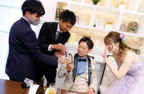 楽しさはもちろん、ご結婚式らしい非日常感も感じてもらえたら…とご希望をいただきキャンドルサービスを行うことに。おふたりの大好きなキャラクターが描かれたキャンドルに灯りをともすと、にぎやかで楽しい雰囲気から幻想的な空気が会場中包みます。光の美しさに目を輝かせたり、向けられるカメラにポーズを決めたりと、ここでも皆様と一緒に楽しまれているご様子のおふたりでした。