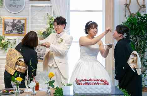 披露宴はTakuyaさんとRinaさんそれぞれの友人の方からスピーチをいただいたり、挙式でリングガールのお手伝いをしてくれた小さなお子様にお礼のプレゼントを渡すなど、とても和やかな空間に。 そんなおふたりはケーキセレモニーでご両家のお母様をお呼び出し♪ 幸せのおすそ分けという意味もあるサンクスバイトに、おふたりからお母様への溢れるばかりのありがとうの気持ちを込めます…♡