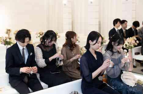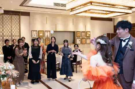 皆様のお手元には小さなBoxが。式が進むと司会者よりBoxのオープンの掛け声がかかり、皆様一斉に開けるとそこには指輪が入っている方が・・・。お二人からのサプライズリングガール&ボーイの演出でした!戸惑いながらも指輪をお二人のもとへゲスト2名様がお届け☆ ゲストの皆様が参加され、あたたかな雰囲気となった素敵な人前式となりました。