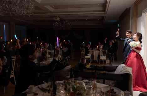 『結婚式』という日に招待する大切な皆様への想いのこもったおもてなしと、楽しくリラックスして過ごせるような空間をイメージされ一生懸命にご準備された新郎新婦様♡ ゲスト参加型イベントとしてご用意されのは、盛り上がること間違いなしのカラードレスの色当てクイズ!サイリウムもご用意され、ライブ会場のようにネオンが光り歓声が沸き起こる中、笑顔でご入場されて行った姿が印象的でした♪