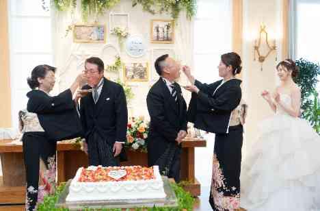 ウェディングケーキのセレモニーでは、新郎新婦様は親御様へのサプライズを♪ 結婚式の1週間前に誕生日を迎えられていた両家のお父様。なんと誕生日が一日違いだという偶然もあり、結婚式でお祝いしたいと計画されました。お母様からお父様へケーキを食べさせていただき、結びにご友人様も一緒に「おめでとう!!」とご唱和いただくと、少し照れくさそうでしたが満面の笑顔を見ることができました♪サプライズ大成功です!