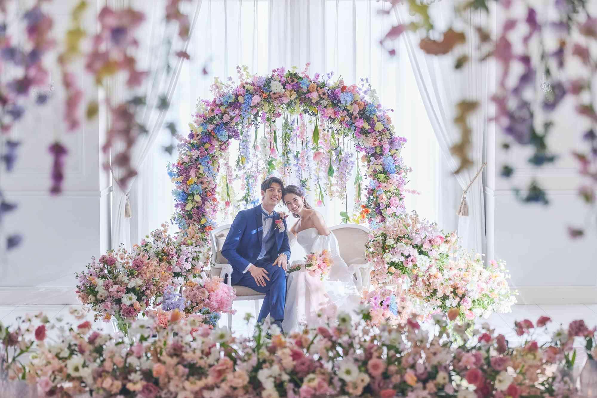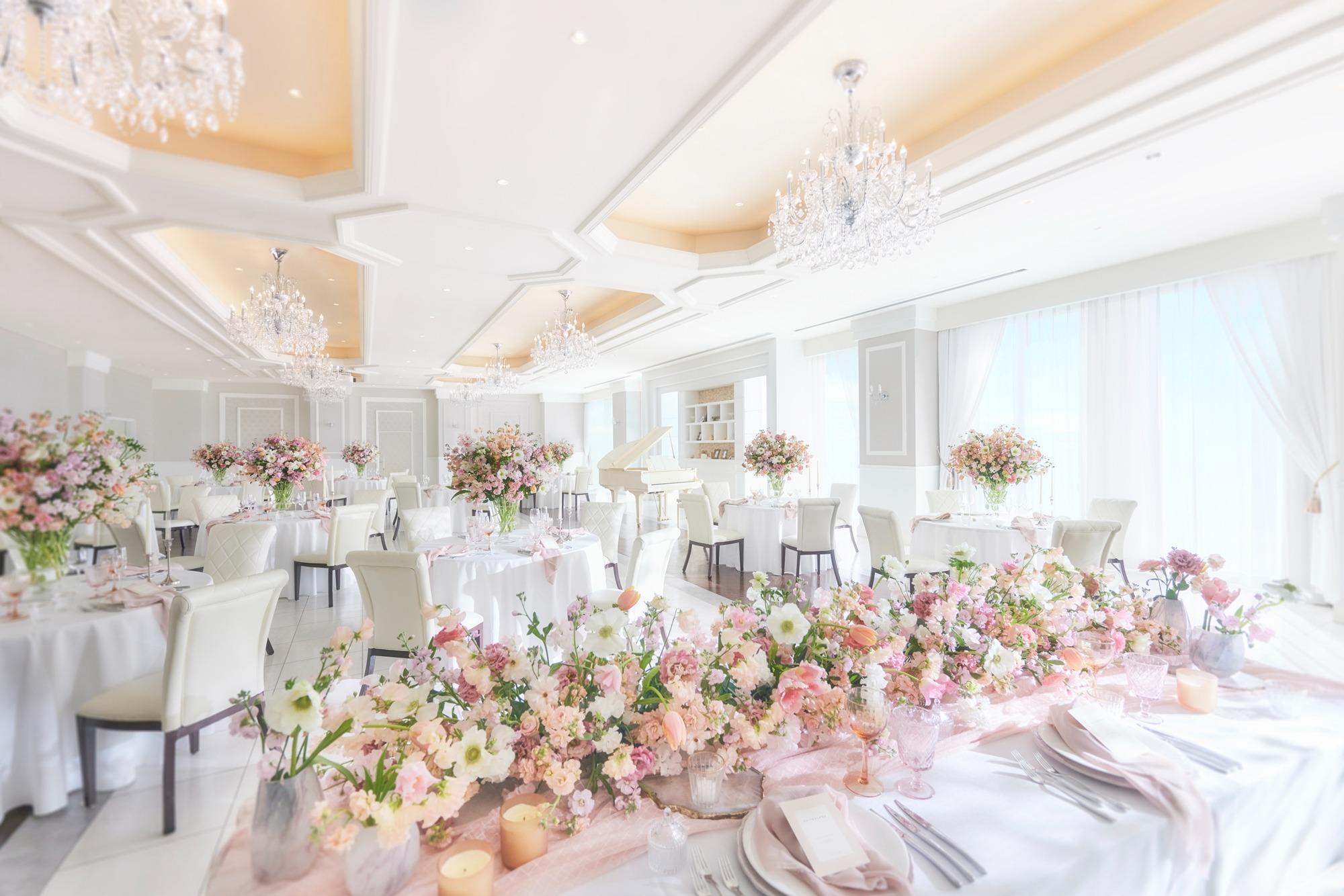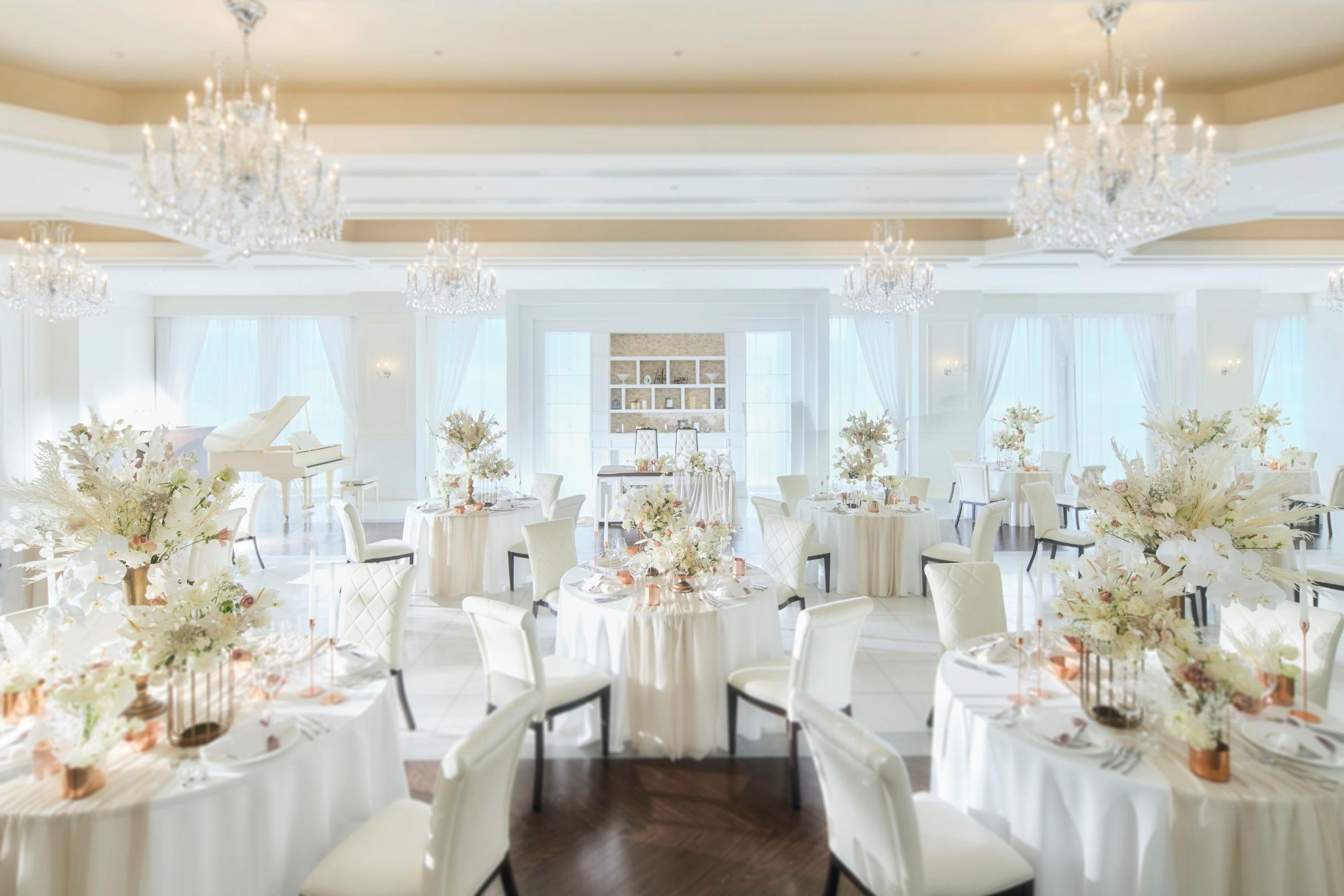 白を基調とした空間に小ぶりなシャンデリアが上品なアクセント。カラフルな花々に彩られた空間は二人の幸せな様子を表したよう。グランドピアノも併設された大人フェミニンな空間【収容人数:160名まで着席可能】