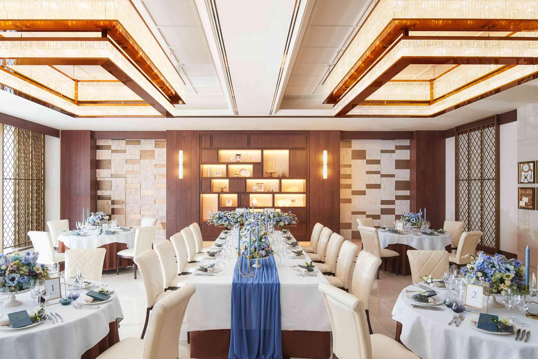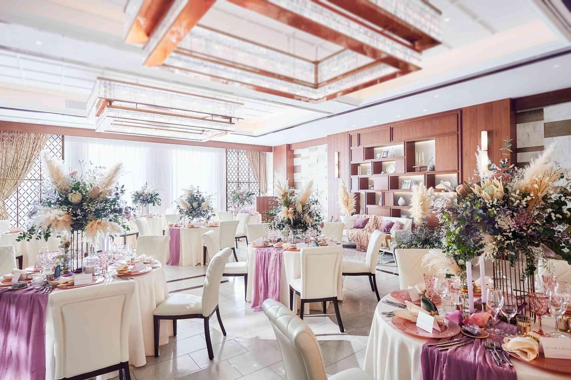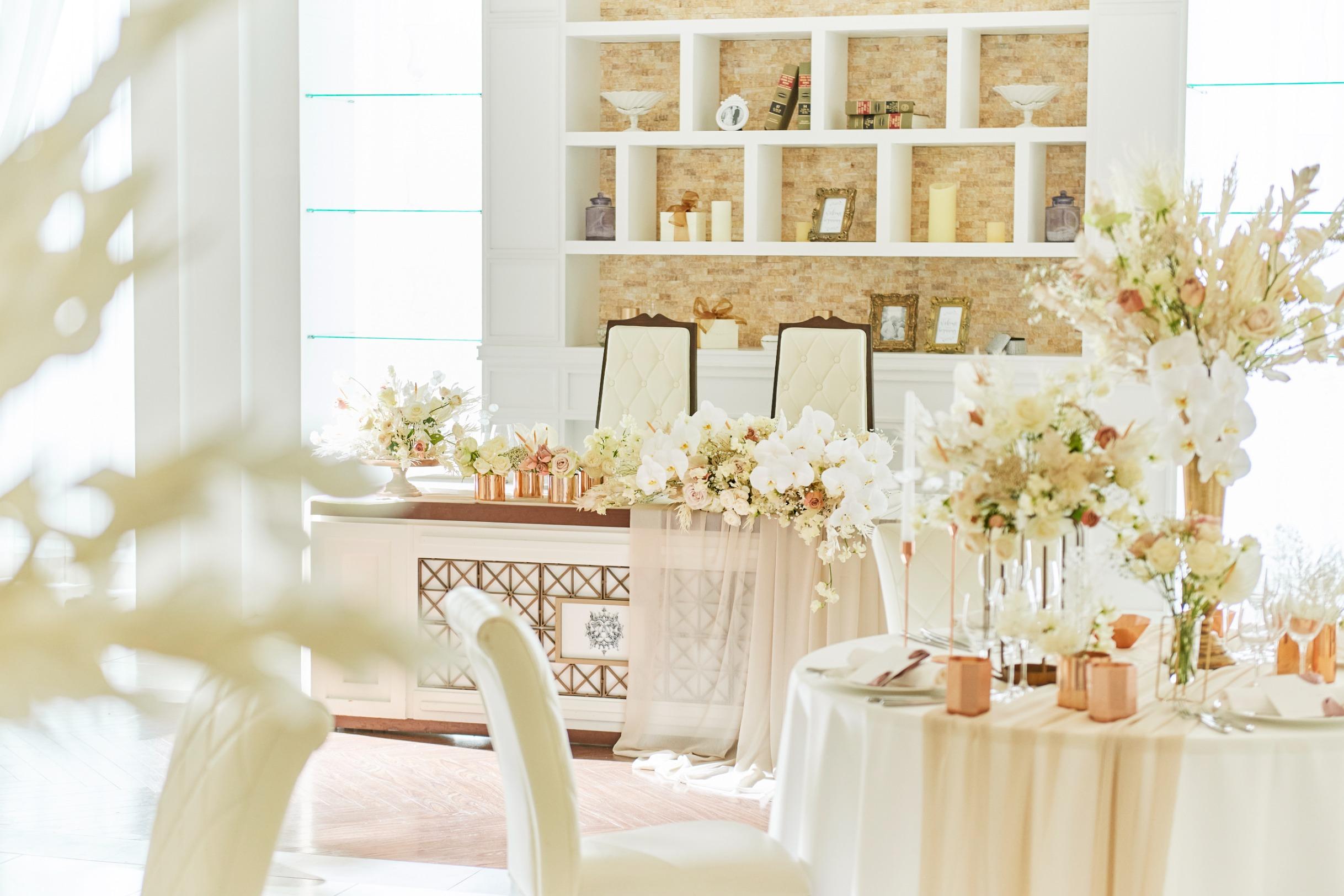 白を基調とした洗練された空間に大ぶりの花々とゴールドをアクセントにした品を感じさせる装飾。余計な演出を省き、ゲストとの歓談と美食を愉しむワンランク上の過ごし方がお勧め【収容人数:160名まで着席可能】