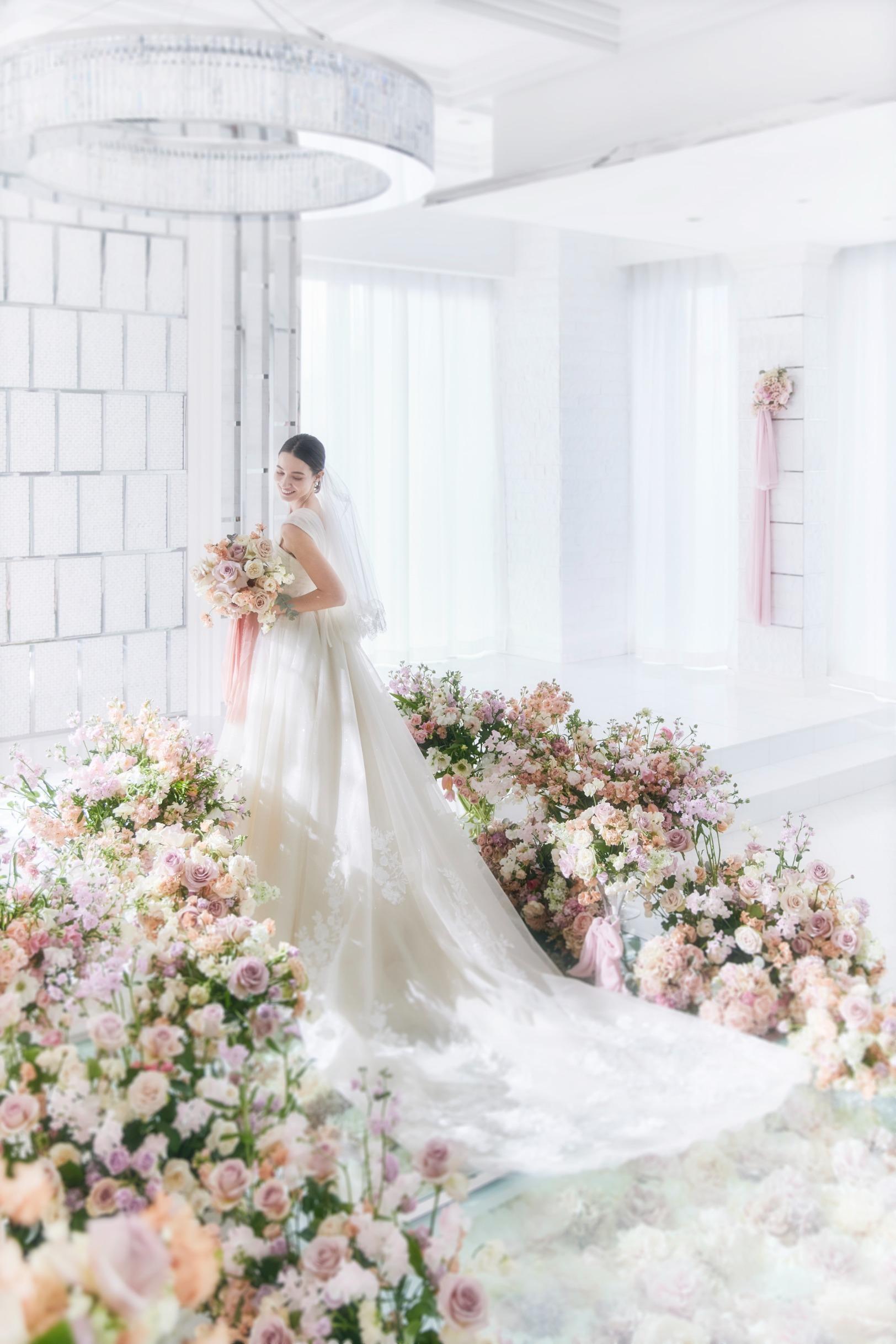 長さ14mのバージンロードには美しい花々が敷き詰められている彩り豊かな空間。ゲストも一歩足を踏み入れた瞬間に感嘆の声があがる。花嫁心をくすぐる大人フェアミニな挙式会場【収容人数:120名まで着席可能】