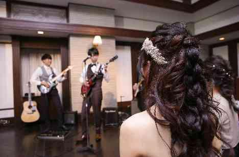 緑とシックなウッド調によりモダンで大人の雰囲気が印象的な会場【翠鳴館】。ウェディングドレスやカラードレスが“映える”カラーコーディネートを考えて、装花やクロス、ペーパーアイテムにこだわりました!余興では新郎自ら楽器を手に取り、ご友人と一緒にライブを♪普段とは違う一面を披露して新郎新婦やご親族・ご友人の皆様も大いに盛り上がりました!