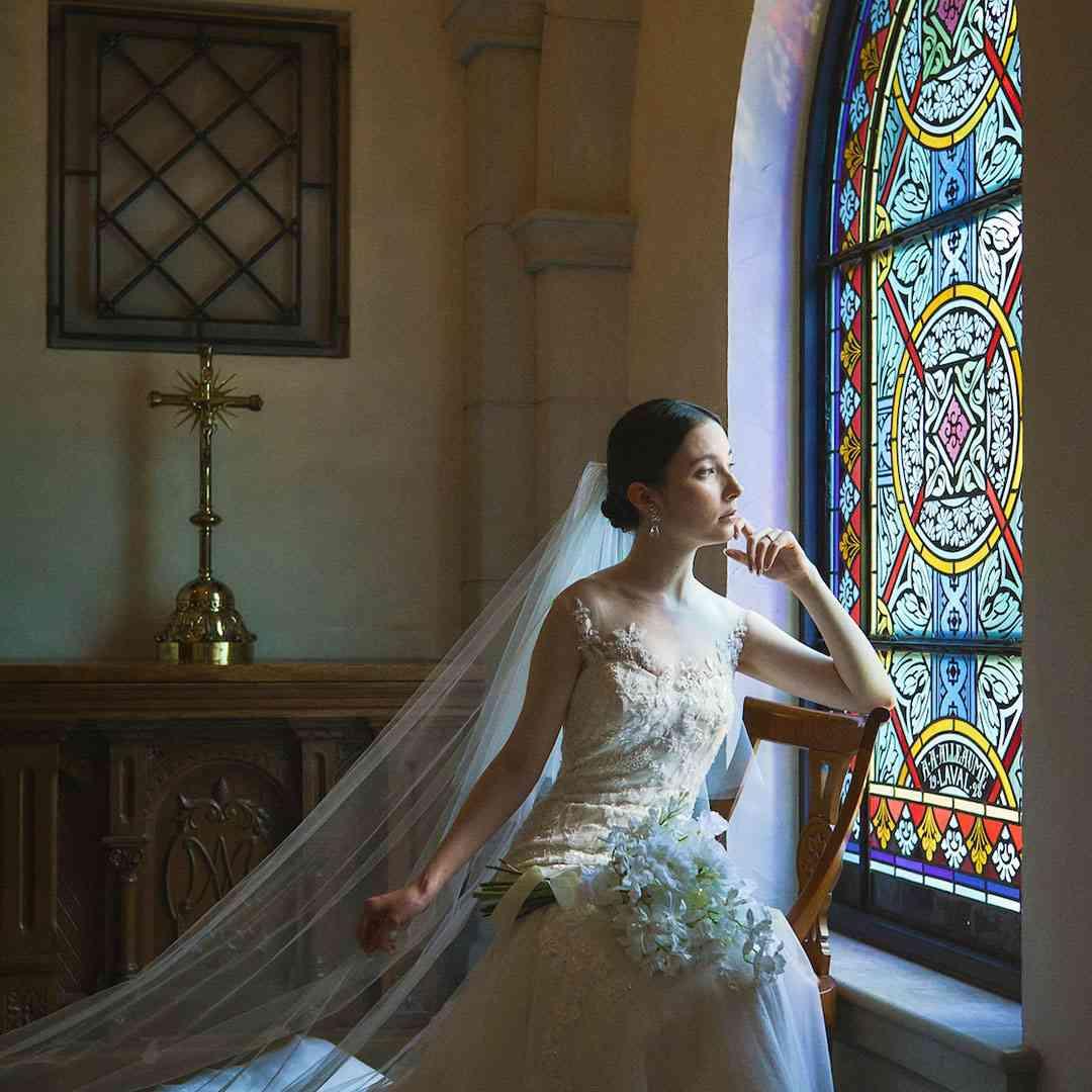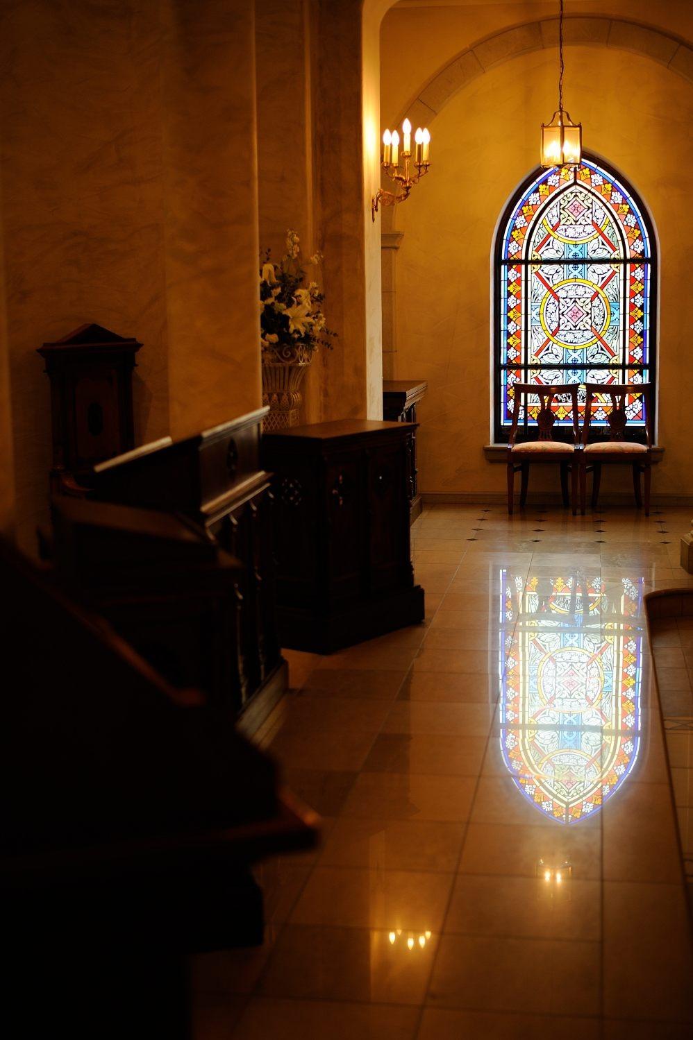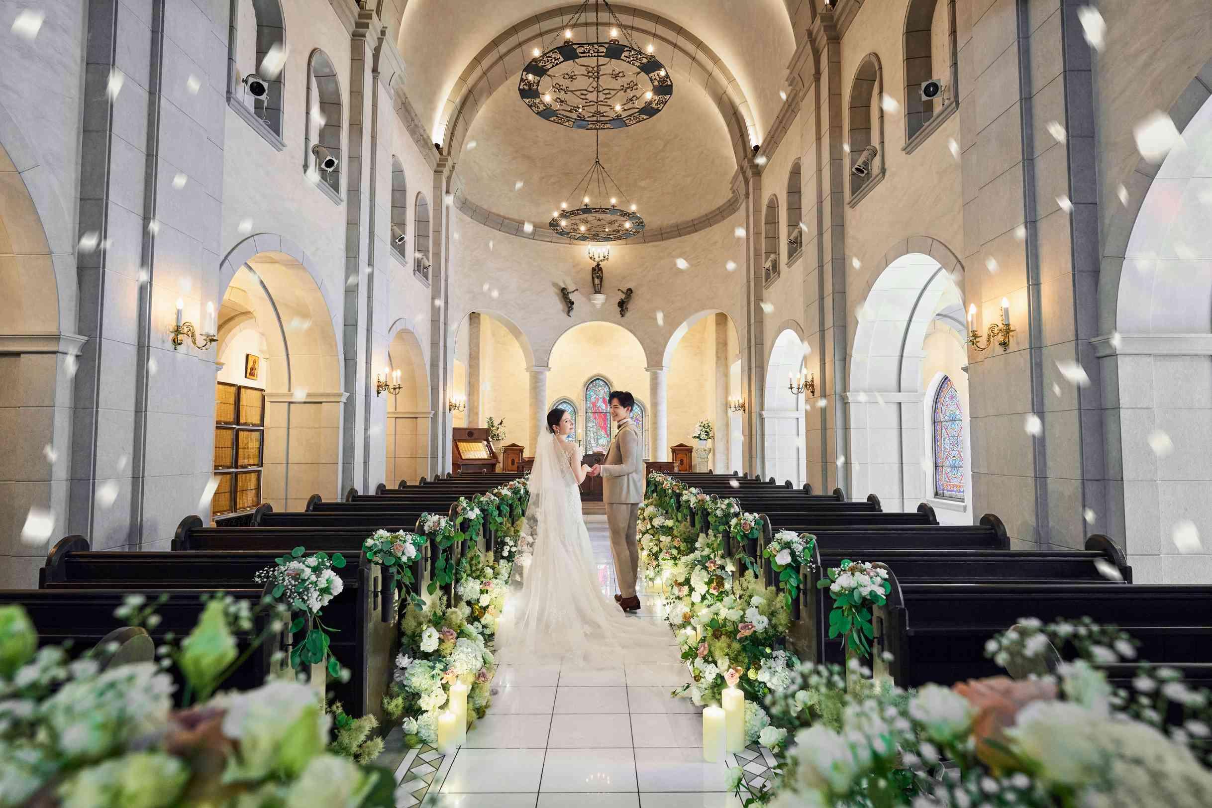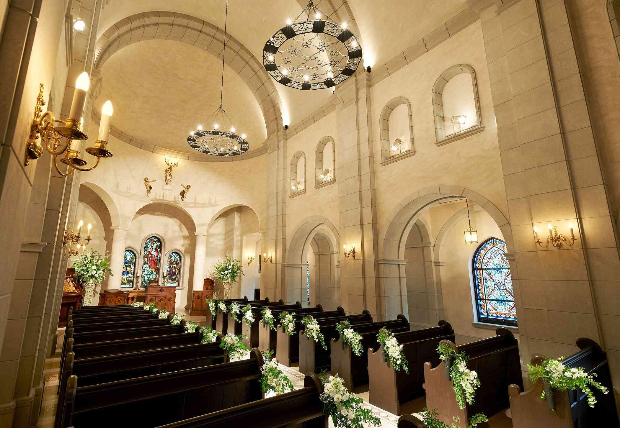 〈天井高10m、バージンロード14m〉ロマネスク様式の建築美が見事な白亜のチャペル。本格的な石造りにこだわり、聖歌隊とパイプオルガン、ヴァイオリンによる生演奏の迫力は圧巻!