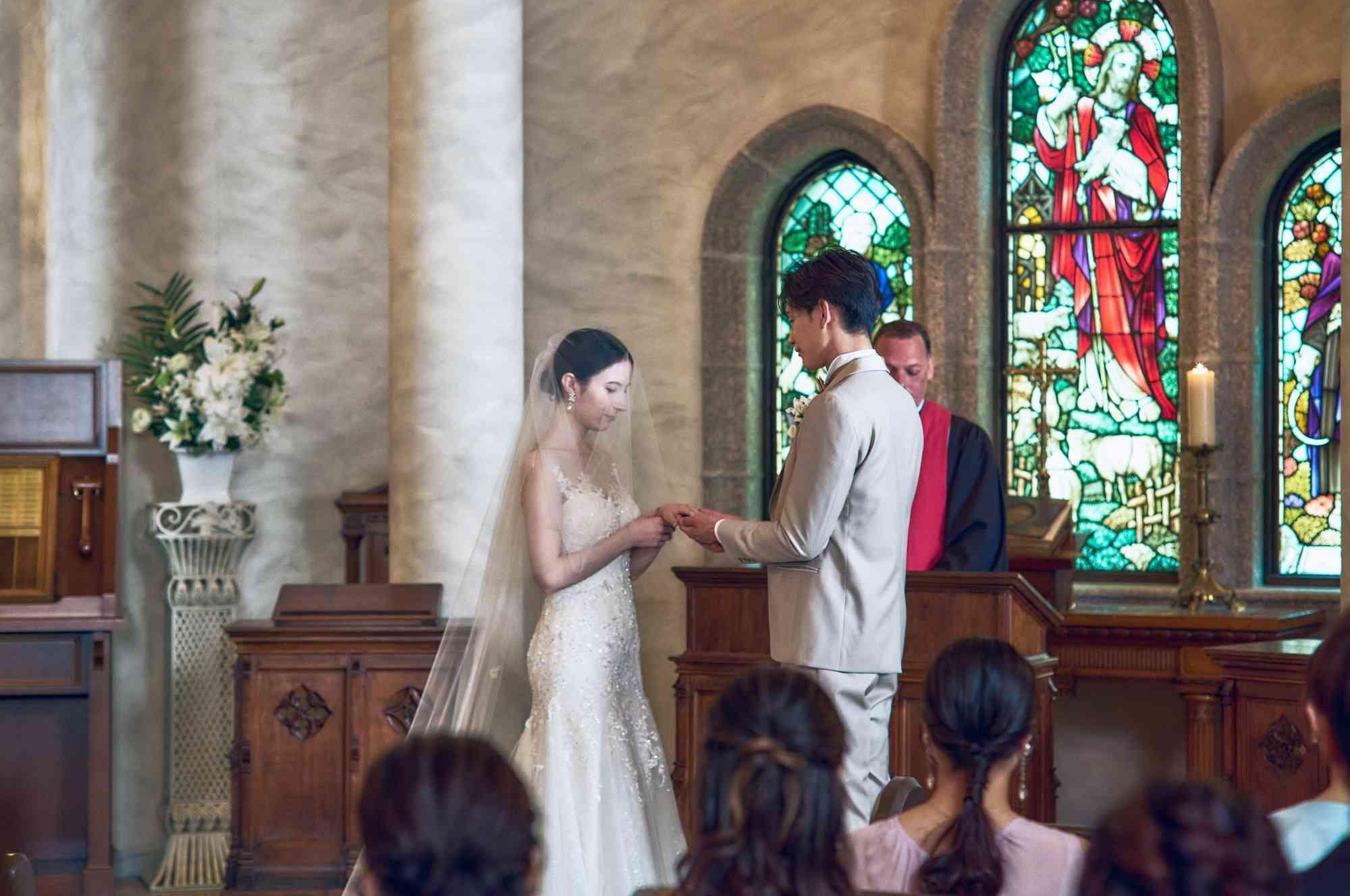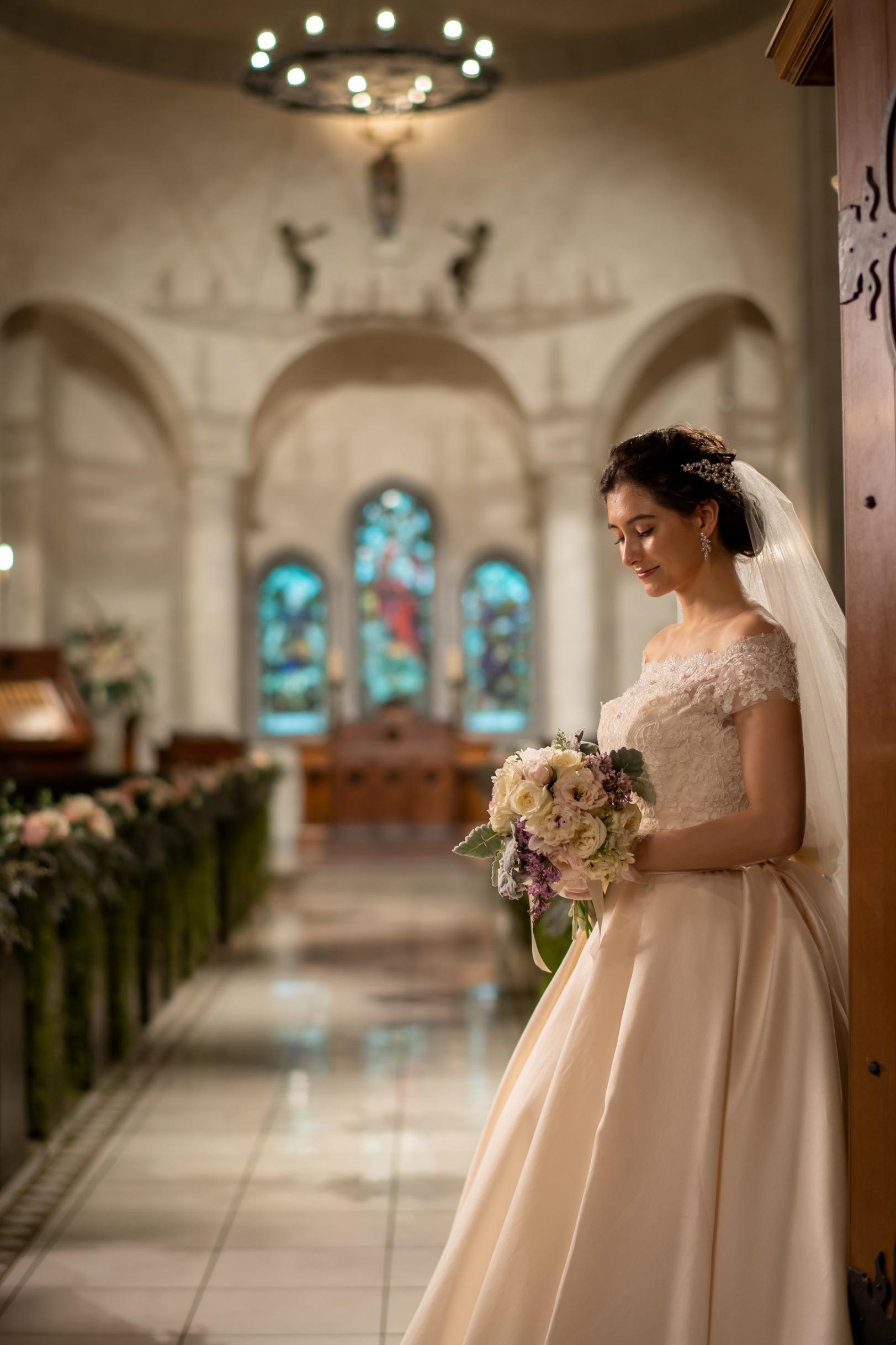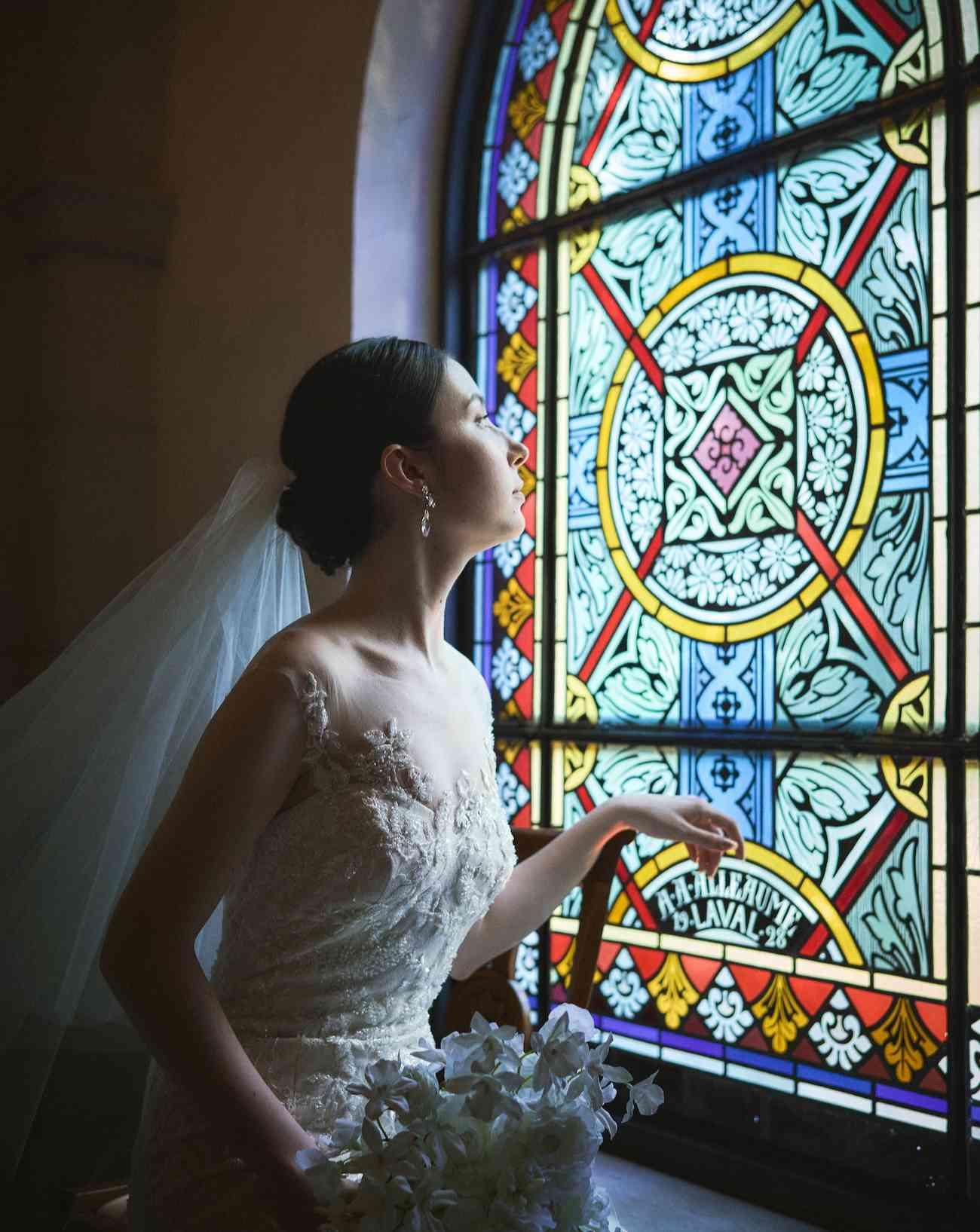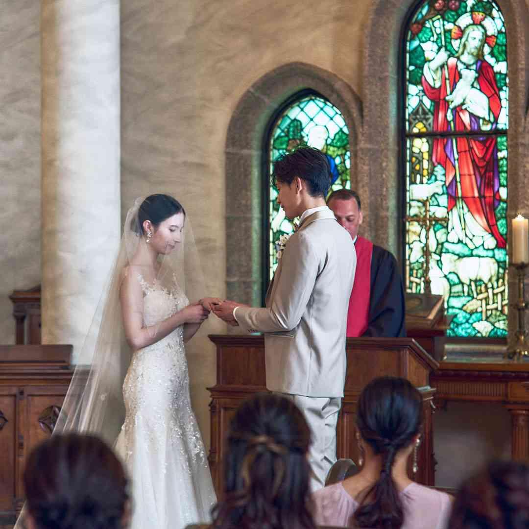 〈天井高10m、バージンロード14m〉ロマネスク様式の建築美が見事な白亜のチャペル。本格的な石造りにこだわり、聖歌隊とパイプオルガン、ヴァイオリンによる生演奏の迫力は圧巻!
