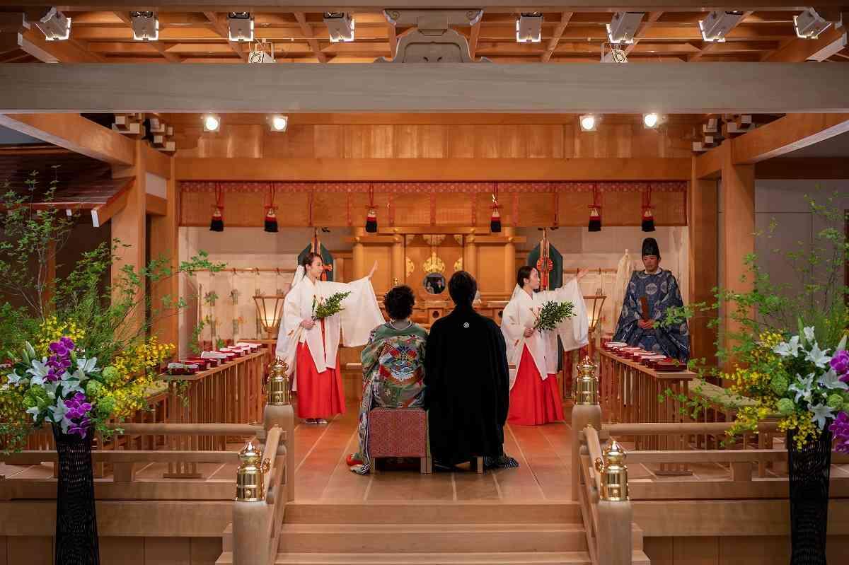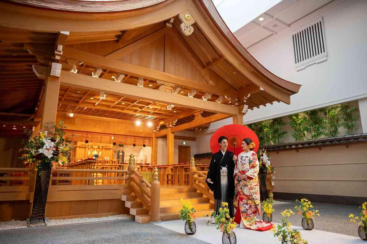 宮大工による本格的な神殿。総檜で造り上げられており、屋内でありながら天窓によって陽光を取り込む抜群のロケーション。神々しい程の佇まいはフォト映え間違いなし!前撮りにオススメ!