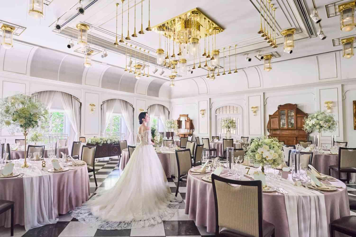 豪華なシャンデリアと大理石フロアは二人好みのコーディネートと自然と調和。大人可愛くもクラシカルにもなる上品な空間でフォトジェニックに想い出を残そう!【推奨人数40名】
