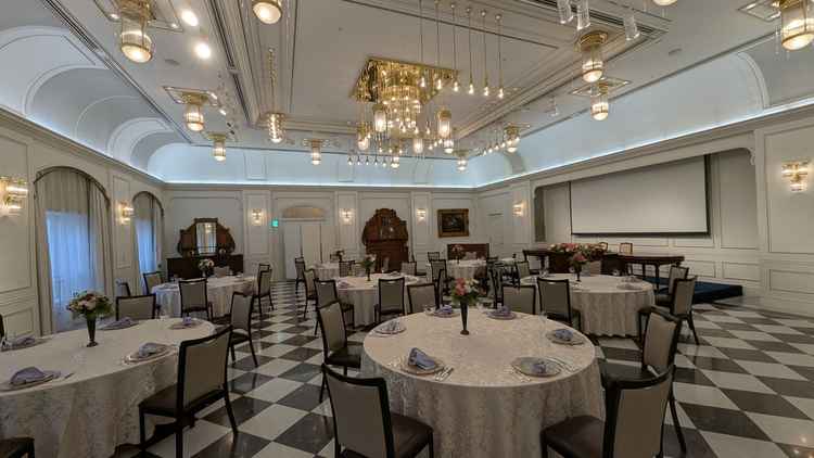 披露宴場の雰囲気が想像以上に素敵だった。 ホテルのバンケットというと使い込まれて特別感が薄れてしまうのではと思っていたが、こだわった装飾や立派な調度品で見劣りしない華やかさがあった。 プラハのダンスホールをイメージして作られたというバンケットが、おしゃれで洗練された雰囲気で素敵だった。