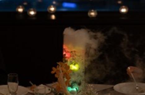 ナイトウェディングならではの演出を用意したおふたり。 再入場後のフォトラウンドで、ミッキーとドライアイスが入ったカゴを配り、おふたりの掛け声で、ミッキーとドライアイスが入ったカゴを一斉に水の中に入れていただきました。高層階からの夜景ととても合っていて、ナイトウェディングらしい、幻想的で、とても盛り上がった演出になりました。