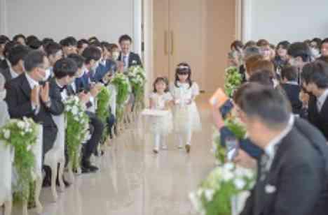 仙台の町や海を一望出来るチャペルで、おふたりの教会式が執り行われました。 リングガールは可愛いお姫様二人が務めてくれました!少し緊張気味のお姉ちゃんと、にこにこ笑顔の妹・・お二人の登場に、会場はほっこり、温かい雰囲気に包まれました。 そして、挙式の後には絶景をバックに、100名様全員での集合写真!記念に残る最高の一枚になりました。