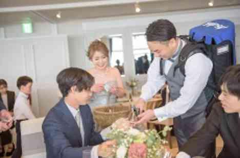 披露宴では、ゲストの方が楽しめる演出を多数用意していました。Mさんの中座では、Mさんのお祖父様がエスコート。陽気なお祖父様が、ゲストの皆様と握手をしながら歩き、会場は大変盛り上がりました。Hさんの中座では、可愛らしいお子様たちが元気いっぱい歌を歌ってくれました! 再入場後は、Hさんが大好きなビールを一人一人にサーブ!会話を交わしながら、おふたりもゲストの皆様もとても楽しそうでした♪