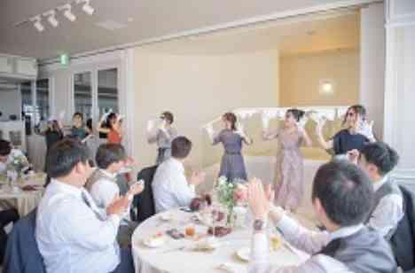 ゲストの方にもご参加いただきたいと余興を2つお願いしていまた。一つ目はMさんの中学校、高校時代のご友人様たちのダンス♪曲の合間で近くのゲストの方に飴をくばったりと、楽しいダンスに会場はとても盛り上がりました!二つ目はMさんのお義姉様に地元宮城の民謡"さんさしぐれ"を披露していただきました。綺麗な歌声にゲストの皆様もスタッフも、みんなが聞き入っていました。楽しい余興におふたりもとても嬉しそうでした。