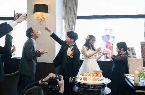 人前式では、皆様ドキドキの、サプライズリングボックスセレモニーを行いました。当たりのBOXを持っていたゲストの方からリングを受けとったお二人はとても嬉しそうな表情をされていました。人前式後、展望台でのアフターセレモニーでは、お菓子まきを行いました♪沢山のお菓子の中にはペヤングやスタバのチケットなどの当たりも紛れ込ませ、お二人もゲストも盛り上がる福まきになりました♡