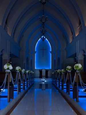 入場直前に流れるチャペルムービー、パイプオルガンの音色、光と映像が織りなす挙式演出でゲストの心にも響く感動的なセレモニー。