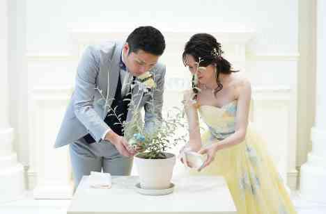 「New Glow」のテーマに合わせて、オリーブの木で水合わせの儀を行いました。オリーブの木の土は迎賓時に、ゲストの皆様からのご協力で入れて頂きました。オリーブの木は平和の象徴から「夫婦の木」や「幸せを呼ぶ木」と呼ばれております。大切なゲストの方々が、これからも平和で幸せな日々が過ごせますようにという願いを込めて行いました。
