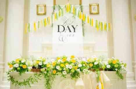 お二人の周りにはどんな方々がいらっしゃいますか?ご家族は?ご友人は?そんな質問を沢山させて頂きました。ゲストを思い浮かべながら、みんなで楽しめる事、みんなと楽しむことをメインに、演出やテーカラーなどを決めました。自然体で笑顔になれるナチュラルなイエロー×グリーン×ホワイトをメインカラーにし、お花のお打合せやお二人のご準備を進めて頂きました。