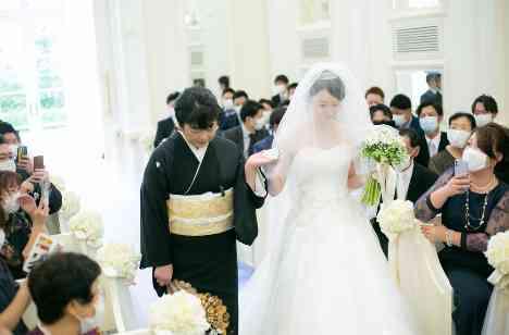 来てくださったお二人の大切なゲストの前で誓いを立てる、人前結婚式。入場は、大好きなお母様と。リハーサルでご新婦様と初対面したお母様の目には、涙を浮かべていました。バージンロードは花嫁の人生を表すと言われています。一歩が一年を表します。お母様も一歩ずつご新婦さまと過ごした月日を思い返しながら進んでくださいました。