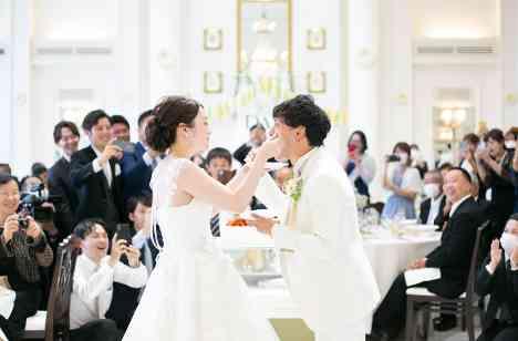 ゲストと楽しむ時間として考えた披露宴。余興はあえて無しにして、ゲストと写真や会話をする時間。その中でも、ゲストに楽しんで頂くイベントとして、ケーキ入刀後のファーストバイトを行いました。通常は、新郎・新婦と順番に行う事が多いですが、ゲストに楽しんで頂く事と自分たちが楽しむことを行える「同時バイト」を行いました。お互いの口に入るのか?ゲストも楽しみながらのシャッターチャンスとなりました。