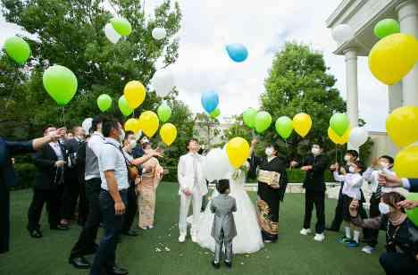 挙式後は、ガーデンでフラワーシャワーと併せてバルーンリリースを行いました。テーマカラーであるイエロー、グリーン、ホワイトのバルーンにしました。お二人は特別にブルーのバルーンで、新婦お父様に向けて空にリリースしました。会場の装飾だけではなく、演出アイテムでもテーマカラーを感じていただけます。ゲスト参加型で、カウントに合わせてリリースした瞬間に歓声と拍手が生まれました。