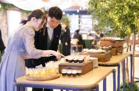 決まったメニューではなく、お好きなデザートを皆様に楽しんでほしいという想いから実現したデザートビュッフェ。 当日は、どれにしようかと迷いながらもたくさんお召し上がりいただき、「やってよかった」とおふたりも嬉しそうにお話しされていました。 ビュッフェにしたことで、ゲストの皆様も自由に動きやすく、自然と会話も弾みます。おふたりのお色直し中も、終始和やかな雰囲気の中でお楽しみいただきました。