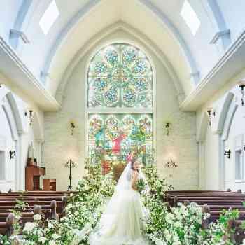 本物のステンドグラスが見守る大聖堂挙式100年の時を刻むステンドグラスが花嫁をより美しく引き立てる