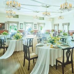 【選べるパーティー会場】リゾートホテルをイメージした会場はふたつのガーデンに面し、大きな窓から入る陽光が開放感と温かみを感じさせる。映画の世界に入り込んだような空間でゲストと過ごす時間をイメージしよう