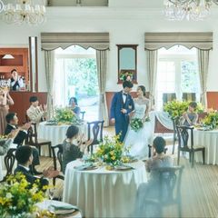 【選べるパーティー会場】リゾートホテルをイメージした会場はふたつのガーデンに面し、大きな窓から入る陽光が開放感と温かみを感じさせる。映画の世界に入り込んだような空間でゲストと過ごす時間をイメージしよう