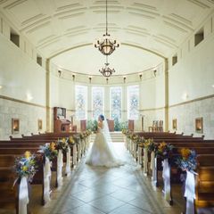 【挙式入場&演出体験】欧州から譲り受けたアンティーク調のステンドグラスがお二人を柔らかく包み込む全天候型のチャペル。フェア当日は、温かみのある空間でゲストに想いを伝える感動のチャペルムービーも体験◎