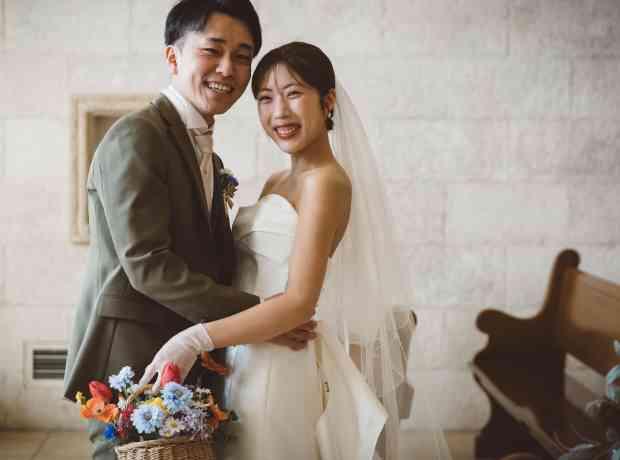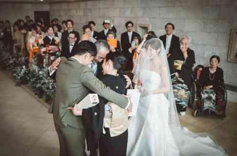 新郎様は新婦様のご実家で一緒に暮らしていたことがあり とても仲が良いです。仲が良いこともあり、新婦親御様から新郎様へ新婦をバトンタッチするシーンでは、なかなか バトンタッチしてくれず・・最後は全員でハグをして和やかな挙式でした。新婦様のご実家で暮らしている愛犬くんにもリングドッグとして挙式に参加していただきました。