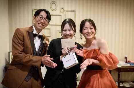 披露宴では、おふたりの“好き”がたっぷり詰まったフルーツたっぷりの三段ウエディングケーキが登場。華やかでおしゃれな見栄えに、会場から歓声があがりました。中座では、それぞれがご兄弟と一緒に退場し、BGMにSnow Manの『ブラザービート』を流しながら、おそ松さんにちなんだ“シェー!”のポーズで楽しく演出。ゲストも思わず笑顔になり、大盛り上がりの瞬間となりました。