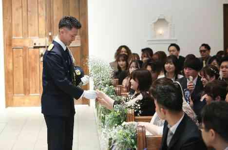 消防隊員であるご新郎様をとても誇りに思っているご両親からのジャケットセレモニー、ご新婦様と姉妹のように仲の良いお母様からのベールダウンは、とても感動的に。そして、挙式の入場は、ご新郎様の一目ぼれで出会ったお二人ならではのブーケブートニアセレモニーを行いました。ご新郎様がゲストの皆様から受け取ったお花を花束にして、プロポーズの言葉と共にご新婦様へお渡し。ご新婦様の嬉しそうな笑顔がとても印象的でした。