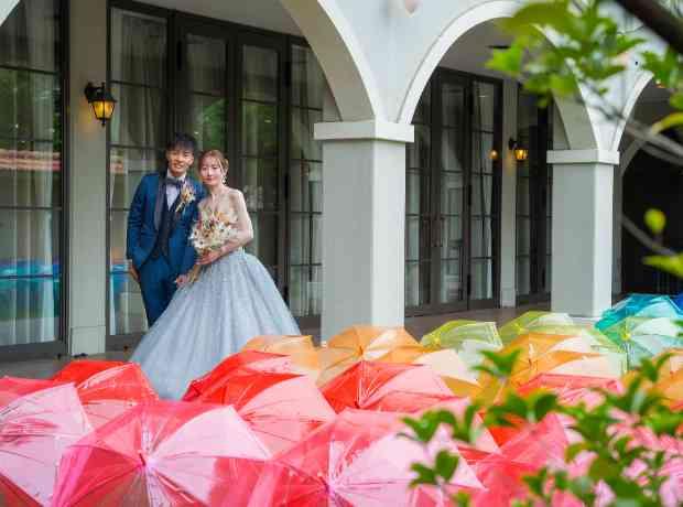 披露宴中、3つのサプライズがありました。1つ目は、ご新婦様のお父様と妹様の誕生日が近いという事で、お二人こだわりのケーキでサプライズバイトを行いました。2つ目はご新郎様の謝辞の後、退場しながらウルフルズのバンザイを熱唱!謝辞に涙するゲストの方もいて、とても感動的な退場シーンになりました。そして、最後はスタッフから・・テラスに傘で虹を作りました。ご新婦様は涙されていて、サプライズ大成功でした!