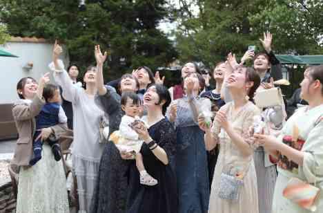 挙式は厳かな雰囲気で進め、セレモニー後は一転してにぎやかで笑顔あふれる時間に。ガーデンでおふたりからゲスト全員に向けて“当たり付きのお菓子まき”を開催しました。小さなお子さまから大人のゲストまで、手にしたお菓子に当たりがあるかどうかを確かめながらわくわくする表情が印象的でした。歓声や笑い声に包まれたその光景は、まるでお祭りのように賑やかで、全員が平等に楽しめるおふたりらしいおもてなしとなりました。
