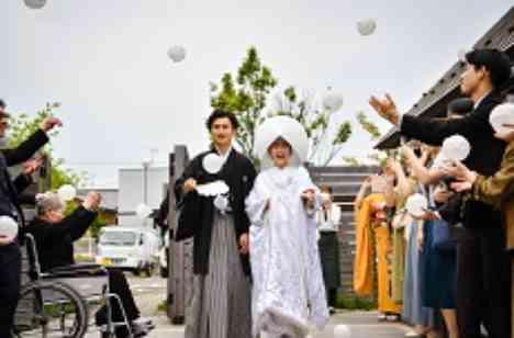 木の温もりや陽光が心地よいチャペルで、おふたりの和装人前式を執り行いました。綿帽子が素敵な白無垢と紋付袴に身を包んだおふたり。Kさんはお母様に羽織を整えてもらい、お父様より扇子を受け取り、Sさんはお父様とご入場し、お母様に紅差しの儀を行っていただきました。人前式の後は、ガーデンセレモニー。和装ならではの紙風船シャワーで、懐かしいと言いながら紙風船を膨らませるゲストの方の笑顔がとても印象的でした。