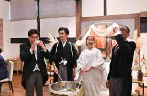 胡蝶蘭の生花を身に着け、番傘を持ってのご入場に、会場からは歓声があがりました。おふたりもゲストの皆様もお酒が好きということで、鏡開きを行いました。まずはご両家のお父様にお酒を酌み、ゲストの皆様にも、お酒を振る舞われました。 お色直しはウェディングドレスとタキシード。加山雄三さんのお嫁においでを熱唱しながら入場したKさんに、会場は大盛り上がりでした!おふたりもゲストも終始笑顔が溢れる披露宴でした。